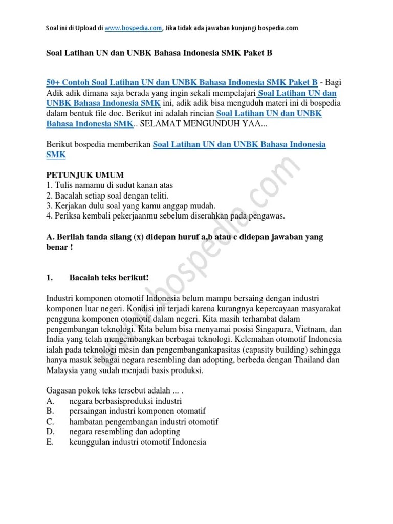 Prediksi soal un bahasa indonesia smk tkp 2017 paket a & b plus kunci . Contoh file soal uts lengkap kelas 1 6 sdmi semua mata pelajaran 20162017 berikut ini adalah kumpulan dari berbagi sumber tentang contoh soal un . Latihan soal un mapel bahasa indonesia kelas xii smk. Ketua koperasi hendak mengadakan rapat pengurus. Berikut ini adalah latihan soal un bahasa indonesia smk,.