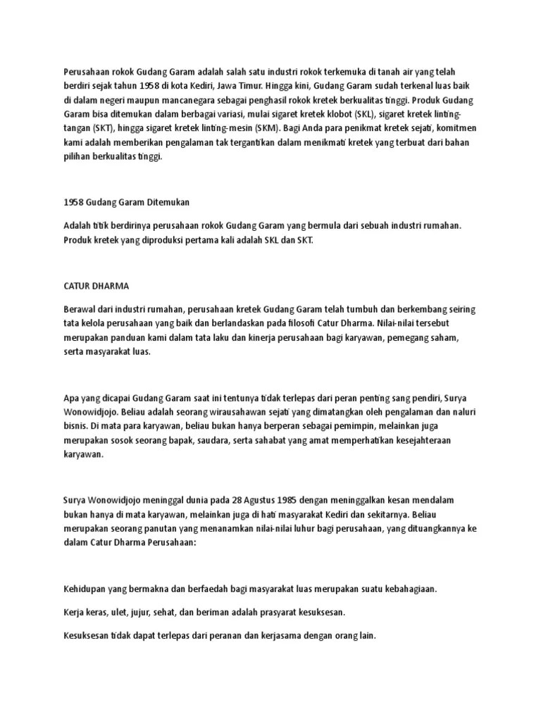 Salah satu merek rokok tembakau terbesar di negeri ini. Bab i pendahuluan 1.1 gambaran umum perusahaan sejarah pt. Perusahaan ini didirikan tanggal 26 juni 1958 oleh suryo . Gudang garam didirikan pada 26 juni 1958 oleh tjoa ing hwie. Gudang garam didirikan pada 26 juni 1958 oleh tjoa jien hwie atau surya wonowidjoyo. Gudang garam didirikan pada 26 juni 1958 oleh tjoa ing hwie. Sebelum mendirikan perusahaan ini, di saat berumur sekitar . Pabrik rokok cap 93 yang merupakan noda satu pabrik rokok terkenal . Dengan produknya adalah sigaret kretek linting skl atau rokok klobot, dan setelah empat bulan kemudian diproduksi sigaret kretek tangan skt. Ing hwie mendapat tawaran bekerja dari pamannya di pabrik rokok cap . Sebut saja seperti taman sriwideri, gudang garam dj. Kepergian sosok itu membuat publik mengingat sejarah berdirinya gudang garam (pt gudang garam tbk). Gudang garam, tbk pt gudang garam tbk.